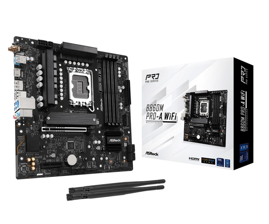 LGA1851, Intel B860, 4xDDR5, Max:5600MHz, Max:256GB, 1xPCIE16, 1xPCIE4, 4xSATA3, RAID, 2xUSB, 3xUSB3.2, 1xUSB4.0C, HDMI, DisplayPort, 7.1, 2.5Gb/s LAN, WiFi, Bluetooth, 2xHyper M.2, 1xBlazing M.2, Micro-ATX