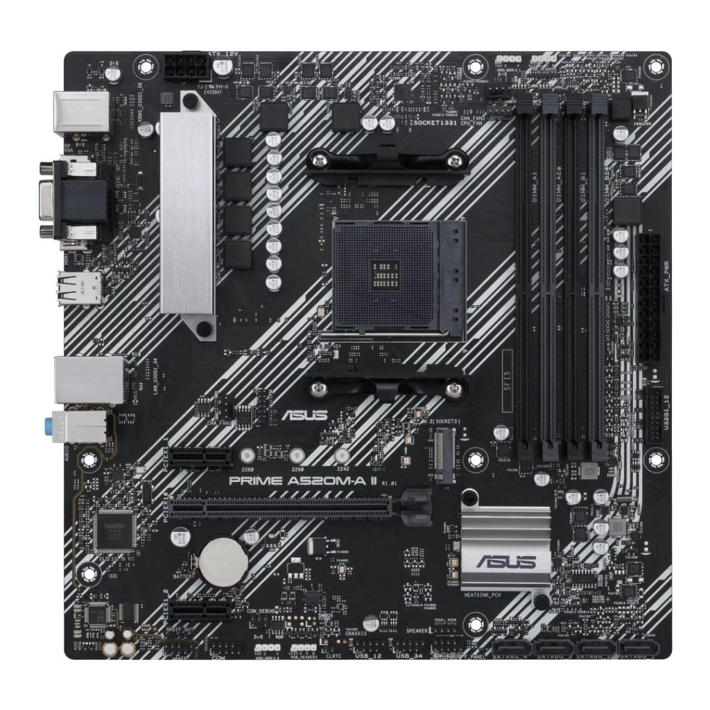 AM4, AMD A520, 4xDDR4, Max:3200MHz, Max:128GB, 1xPCIE16, 2xPCIE1, 4xSATA3, RAID, 2xUSB, 4xUSB3.2, VGA, HDMI, DisplayPort, PS2:1 db, 7.1, Gigabit, 1xM.2, Micro-ATX